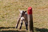 Schichtig Lammetje, nog een beetje onstabiel op de poten. Nieuwsgierig en onwennig rondlopend in het veld.
