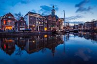 De Lange Haven in Schiedam tijdens het blauwe uur. Aan de overkant van de gracht zie je het Jenevermuseum en de Havenkerk.