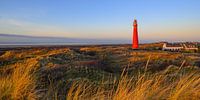Panorama Schiermonnikoog in de duinen met de vuurtoren tijdens zonsondergang op het waddeneiland tijdens een mooie winterdag. Schiermonnikoog maakt deel uit van de Friese Waddeneilanden en staat bekend om zijn prachtige natuur, waaronder zandstranden, glooiende duinen en weelderige wetlands.