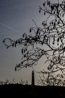 Een mooie foto gemaakt op het eiland Schiermonnikoog, een silhouet foto van de vuurtoren met een doorkijkje door een boom. Een prachtige foto voor aan je muur.