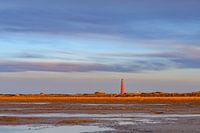 Schiermonnikoog panoramisch uitzicht op het strand tijdens zonsondergang met de vuurtoren in de duinen op het waddeneiland tijdens een mooie winterdag. Schiermonnikoog maakt deel uit van de Friese Waddeneilanden en staat bekend om zijn prachtige natuur, waaronder zandstranden, glooiende duinen en weelderige wetlands.
