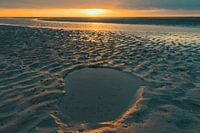 Kleurrijke zonsondergang op het Noordzeestrand van het eiland Schiermonnikoog in het Nederlandse Waddengebied aan het eind van de dag. Schiermonnikoog maakt deel uit van de Friese Waddeneilanden en staat bekend om zijn prachtige natuur, waaronder zandstranden, glooiende duinen en weelderige wetlands.