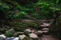 Een prachtige sprookjesachtige waterval in Mullerthal. Het is de hoogste waterval van Luxemburg en is bekend als de Schiessentümpel. Je loopt over het stenen bruggetje om daarna een gedraaide trap af te dalen om zo benenden bij de waterval te komen.