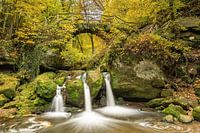 Herfstfoto van de kleine pittoreske Schiessentümpel waterval in de regio Mullerthal in Luxemburg. Het water van de Zwarte Ernz schiet in drie stromen over een rotsrand in een waterbassin beneden en gaat dan verder in de richting van het dorp Mullerthal. Samen met de idyllische brug van steen en hout, de omringende rotsen en de weelderige vegetatie is het een van de meest populaire excursiebestemmingen in de regio Mullerthal (ook wel Luxemburgs Klein Zwitserland genoemd) geworden.