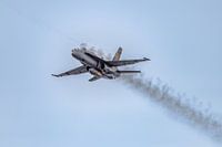 Een schietende McDonnell Douglas F/A-18C Hornet van de Zwitserse Luchtmacht. Als je goed kijkt op de foto kun je afgevuurde munitie zien.