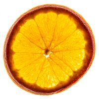 Schijfje oranje sinaasappel geïsoleerd op een witte achtergrond van bovenaf gefotografeerd.