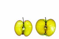 Twee schijfjes groene appel geïsoleerd op een witte achtergrond van bovenaf.