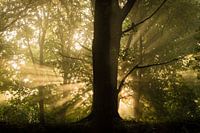 Schijnt achter Mooie zonnestralen die bij een zonsopgang achter een majestueuze boom schijnen. Een mistige ochtend maakte het speciaal en intens. Warme kleuren en intense schaduwen.