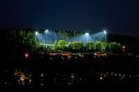De schijnwerpers van het Dietmar Hopp Stadion van Hoffenheim verlichten het hoogste punt van de wijk Sinsheim.