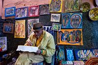 Een schilder aan het werk voor een muur met zijn schilderijen, in de stad Marrakesh, Marokko. Kleurrijke kunstwerken en portretfotografie / straatfotografie.