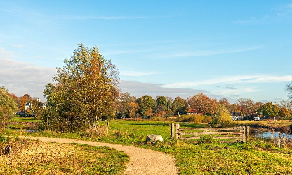 Schilderachtig landschap met een gebogen fiets- en wandelpad in het natuurgebied Markdal ten zuiden van de Nederlandse stad Breda, provincie Noord-Brabant. De foto is gemaakt aan het begin van een zonnige ochtend in het herfst seizoen.