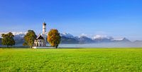 De kerk van St. Coloman bij Schwangau op een zonnige herfstochtend tegen de achtergrond van de Allgäuer Alpen. Beieren, Duitsland