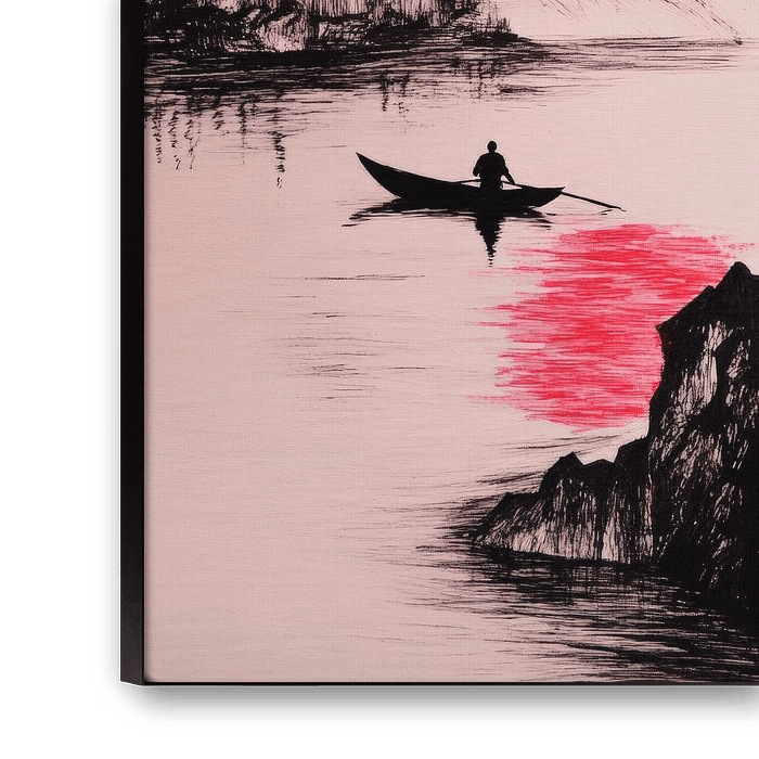 Een felrode zonsondergang verlicht het rustige landschap terwijl een eenzame peddelaar zachtjes over het water glijdt. De contrasterende combinatie van ruige bergen en delicate bomen creëert een harmonieuze sfeer. Dit kunstwerk is perfect voor de woonkamer om een vleugje rust en natuur in de kamer te brengen.