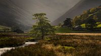 Mooi boompje langs een riviertje in een mooie vallei met in de achtergrond de mooie bergen van de Lake District.