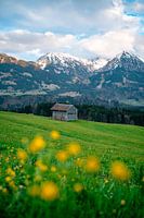 met het uitzicht over een paardenbloemenweide naar de Entschenkopf en de Rubihorn