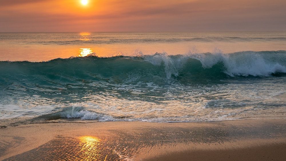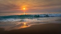 Deze foto toont een dromerige zonsondergang aan zee, met zachte golven die op het strand rollen. De warme, gouden tinten van de lucht worden weerspiegeld op het natte zandoppervlak en creëren een rustgevende en romantische sfeer. Perfect voor thema's als natuur, reizen, ontspanning en landschapsfotografie. Het beeld straalt een gevoel van vrede, sereniteit en de tijdloze schoonheid van de kust uit.