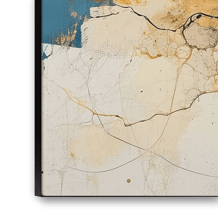 Schilderij Aardetinten Abstract | Aardetinten - Dit schilderij toont een gelaagd abstract landschap met een mix van aardetinten en spatten van kobaltblauw die een organische, doorleefde esthetiek oproepen. De gekraakte textuur voegt een tactiele diepte toe, terwijl de vloeiende lijnen een subtiele beweging suggereren, wat een rustige, maar intrigerende harmonie creëert.