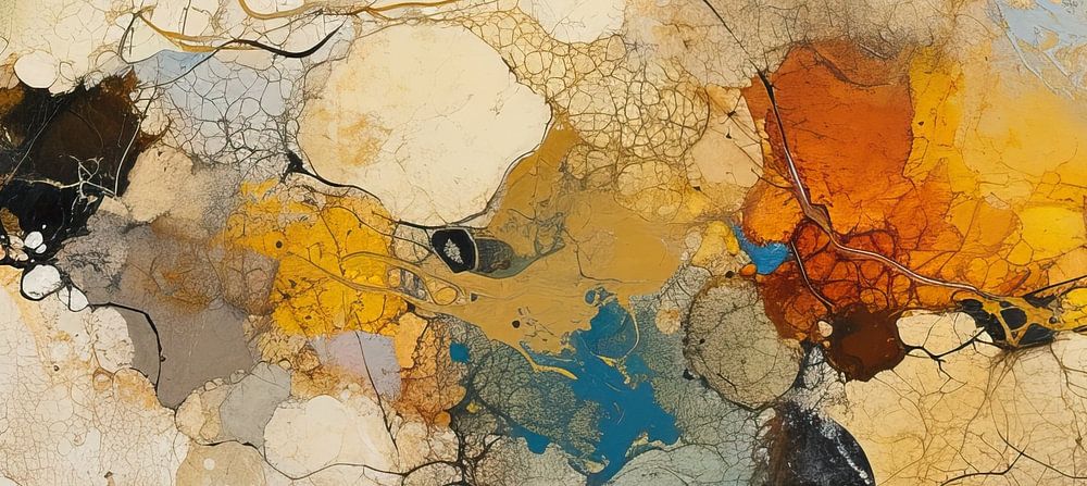 Details: abstract, organisch, textuur, aardetinten, blauw, geel, wit, zwart, rustiek, modern, Warm glow