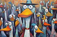 Schilderij Abstracte Eenden | Hoedenparade in Eendenstad - kleurrijke, grappige vogels, abstracte eenden