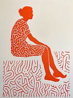 Details: abstract, mensfiguur, lijnspel, oranje, wit, kunst, profiel, zittend, spiraal, modern