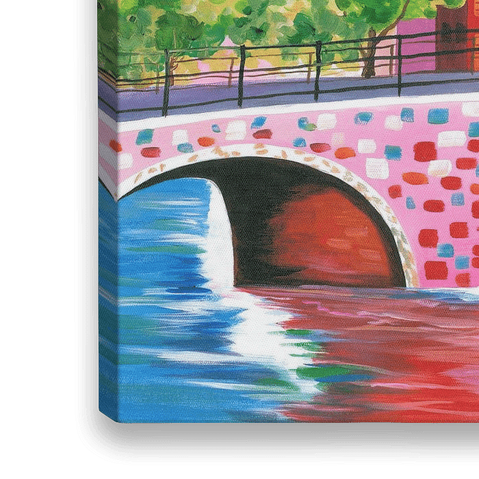 Kleurrijk geschilderd stadsgezicht: schilderij van grachtengordel Amsterdam. Hier wordt je gegarandeerd vrolijk van! De penseelstreken zijn ook bij druk op canvas of aluminium mooi zichtbaar.