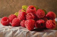 Details: frambozen, fruit, stillevenschilderij, realistisch, rood, groen, bruin, bladeren, textuur, tafelkleed
