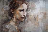 Blikvanger voor in woonkamer boven de bank? Dit ingetogen portret combineert figuratieve kunst met abstracte achtergrond - een mooi contrast tussen het vrouwelijke portret en abstracte achtergrond.