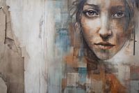 Blikvanger voor in woonkamer boven de bank? Dit ingetogen portret combineert figuratieve kunst met abstracte achtergrond - een mooi contrast tussen het vrouwelijke portret en abstracte achtergrond.