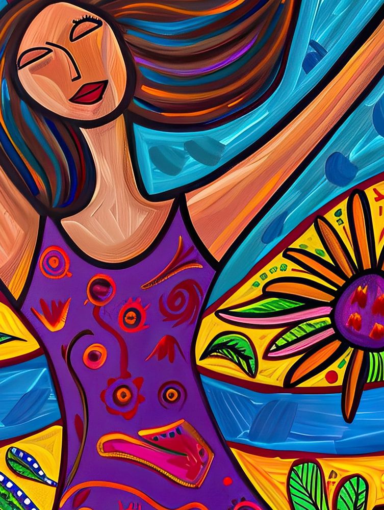 Details: vrouw, bloemen, dansen, vrolijk, kleurrijk, abstract, modern, expressief, kunst, levendig