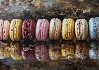 Schilderij: Macarons - Met een uitgesproken smaak voor de fijnere dingen, presenteert dit kunstwerk een rij hemelse macarons, rijk aan textuur en kleur tegen een achtergrond die doet denken aan gesmolten chocolade en vleugjes goud. De weerspiegeling onderaan voegt diepte toe en verleidt je zintuigen, terwijl het luxe palet van bruin- en goudtinten een weldadige warmte uitstraalt.