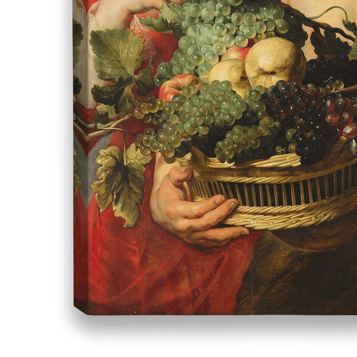 Deze man, een Sater, en vrouw, een nimf (halfgod) hebben een mand vol met fruit in handen en kijken gelukken met een brede glimlach op het gezicht. Appels en druiven liggen op de schaal.