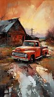 Schilderij Rundown Barn In The Snow - Dit schilderij toont een oude, vervallen schuur in een besneeuwd landschap. De schuur heeft een gedempte rode kleur en staat naast een stroompje. Op de natte, modderige oprit staat een grote, verwaarloosde gele pick-up truck. Het schilderij is hypergedetailleerd en toont de sneeuwvlokken die uit de…