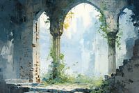 Schilderij Schoonheid in Verval - Dit eeuwenoude ruïne biedt een sereen beeld van vervallen zuilen en bogen, zacht overwoekerd door de natuur. Het lichtval creëert een dromerige sfeer, terwijl de ruwe penseelstreken en aardse kleuren dit tafereel een bepaalde textuur en diepte geven.