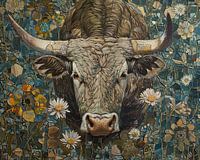 Details: stier, bloemen, mozaïek, hoorns, natuur, dier, kunst, portret, neusgaten, ogen