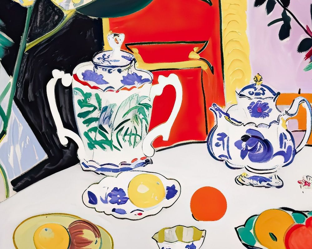 Dit eetkamer stilleven in expressionistische stijl toont een gedekte tafel met een theepot, kopjes en planten.