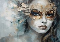 Schilderij Vrouw met Masker - In dit betoverende portret is een vrouwengezicht afgebeeld achter een gedetailleerd masker, dat met zijn gouden accenten en gedetailleerde textuur een gevoel van mysterie opwerpt. De kunstenaar maakt gebruik van een beperkt kleurenpalet, dominerend in blauwe en bronstinten, onderbroken door hints van goud dat het masker tot een tastbaar symbool van verborgen waarheden maakt. Dit stuk spreekt tot de verbeelding over wat er achter onze façades schuilgaat.