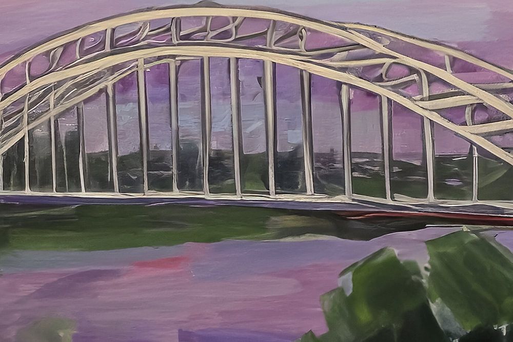 Unieke digitale schilderij van de Waalbrug in Nijmegen, ideaal als wanddecoratie. Gemaakt van een echte foto, perfect voor een indrukwekkend kunstwerk aan de muur.