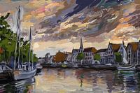 Unieke digitale schilderij van zeilboten in Haarlem, ideaal als wanddecoratie. Gemaakt van een echte foto, perfect voor een indrukwekkend kunstwerk aan de muur.