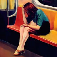 Schilderij geinspireerd door Edward Hopper. Hopper (Nyack, New York, 22 juli 1882 – New York, 15 mei 1967) was een Amerikaans kunstschilder die schilderijen maakte met typisch Amerikaanse thema's. Zijn schilderijen behoren tot het realisme en de American scène. Hopper creëert in zijn schilderijen een onwerkelijke, desolate sfeer. In veel van zijn schilderijen heerst een psychologische spanning. De mensen op zijn schilderijen zijn nooit gelukkig. Ook wekken de schilderijen een gevoel van "samen maar toch alleen" op. In dit werk zie je een abstracte weergave van een vrouw in de metro in de typische Hopper kleuren.