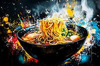 Een opvallend, levendig kunstwerk waarin een dampende kom ramen centraal staat. De rijke kleuren en expressieve spatten geven een dynamisch gevoel dat perfect past in een modern interieur. Ideaal voor liefhebbers van kunst met energie en culinaire passie.