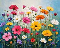 In het hart van een uitgestrekt bloemenveld, explodeert een felle symfonie van kleuren. Rode klaprozen dansen op de wind, terwijl gele zonnebloemen hun gezichten naar de stralende zon draaien. De lucht is doordrenkt met de geur van bloeiende flora, die de zintuigen prikkelt en de geest bevrijdt. Groene stelen kronkelen als golven in een zee van chaos, elk bloemblad draagt de emotie van de aarde. Het landschap pulserend van leven, weerspiegelt de innerlijke vreugde en de diepere melancholie van de natuur. In deze expressieve uitbarsting van kleuren, lijkt de wereld te ademen, te voelen en te dromen.