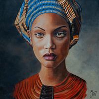 Prachtige Afrikaanse dame met kleurrijke hoofddoek op een achtergrond met subliem geschilderd lichtinval. Rode ketting met zwarte sluiting. Indringende, bruine ogen met gouden flikkering. Een aanwinst voor uw interieur en passend bij diverse trends. Warme gloed.
