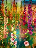 Schilderij met bloeiende stokrozen in warme tinten.