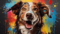 Schilderij van een hondengezicht met kleurrijke verfspatten