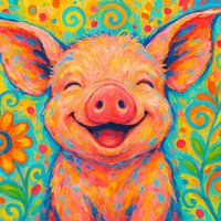Kleurrijk schilderij van een lachend varken. Op de achtergrond wervelende patronen en bloemmotieven in levendige kleuren.