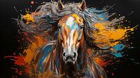 Schilderij van een paardengezicht met kleurrijke verfspatten