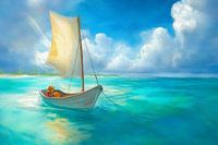 Schilderij van een zee landschap met een kleine zeilboot die op helder, turquoise water drijft. De zeilboot heeft een groot, beige zeil dat de wind vangt. Op de achtergrond is een kustlijn te zien met palmbomen en een heldere blauwe lucht met enkele witte wolken.