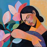 Dit schilderij toont een vrouw in een introspectieve houding. Haar hoofd is licht gekanteld en haar ogen zijn gesloten, wat een gevoel van rust uitstraalt. De achtergrond is verdeeld in contrasterende vlakken, wat diepte toevoegt aan de compositie. Een magnolia met zachte bladeren en takken omlijst de vrouw en benadrukt een connectie…