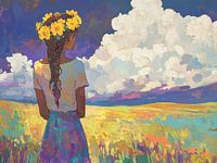 Schilderij - Uitzicht bloemen. Panorama uitzicht meisje met bloemen. Impressionisme portret schilderij van vrouw bij een uitzicht op een landschap.