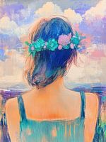 Schilderij - Panorama met bloemen. Panorama uitzicht meisje met bloemen. Impressionisme portret schilderij van vrouw bij een uitzicht op een landschap.